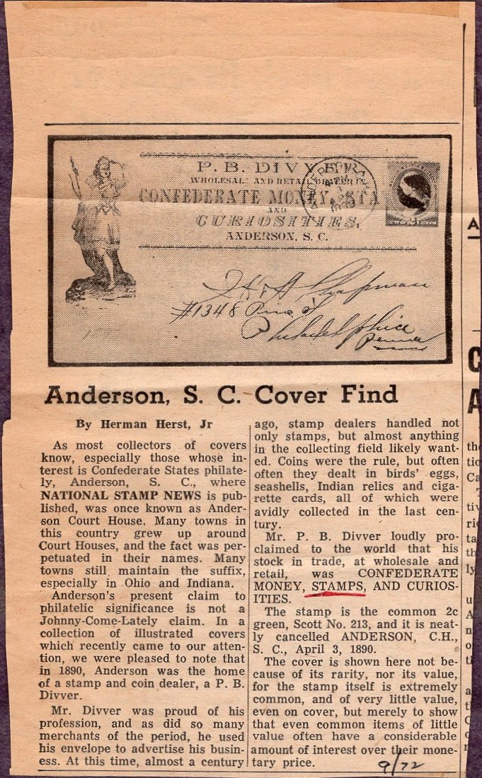Retail Dealer in CONFEDERATE MONEY, STAMPS and CURIOSITIES". A very